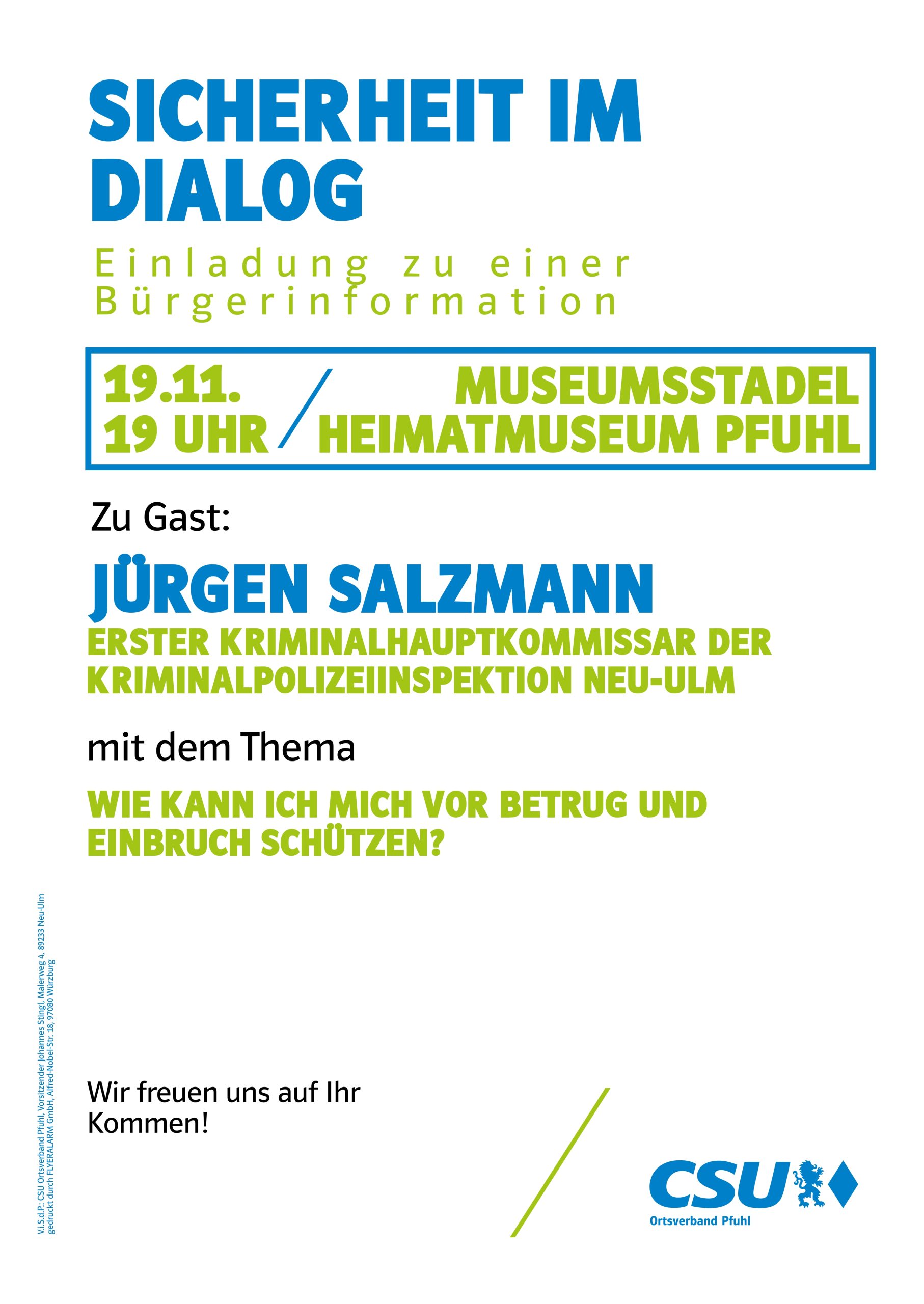 Als Gastredner konnten wir Herrn Jürgen Salzmann, erster Kriminalhauptkommissar der Polizeiinspektion Neu-Ulm, gewinnen. Er wird zum Thema „Wie kann ich mich vor Betrug und Einbruch schützen?“ sprechen.