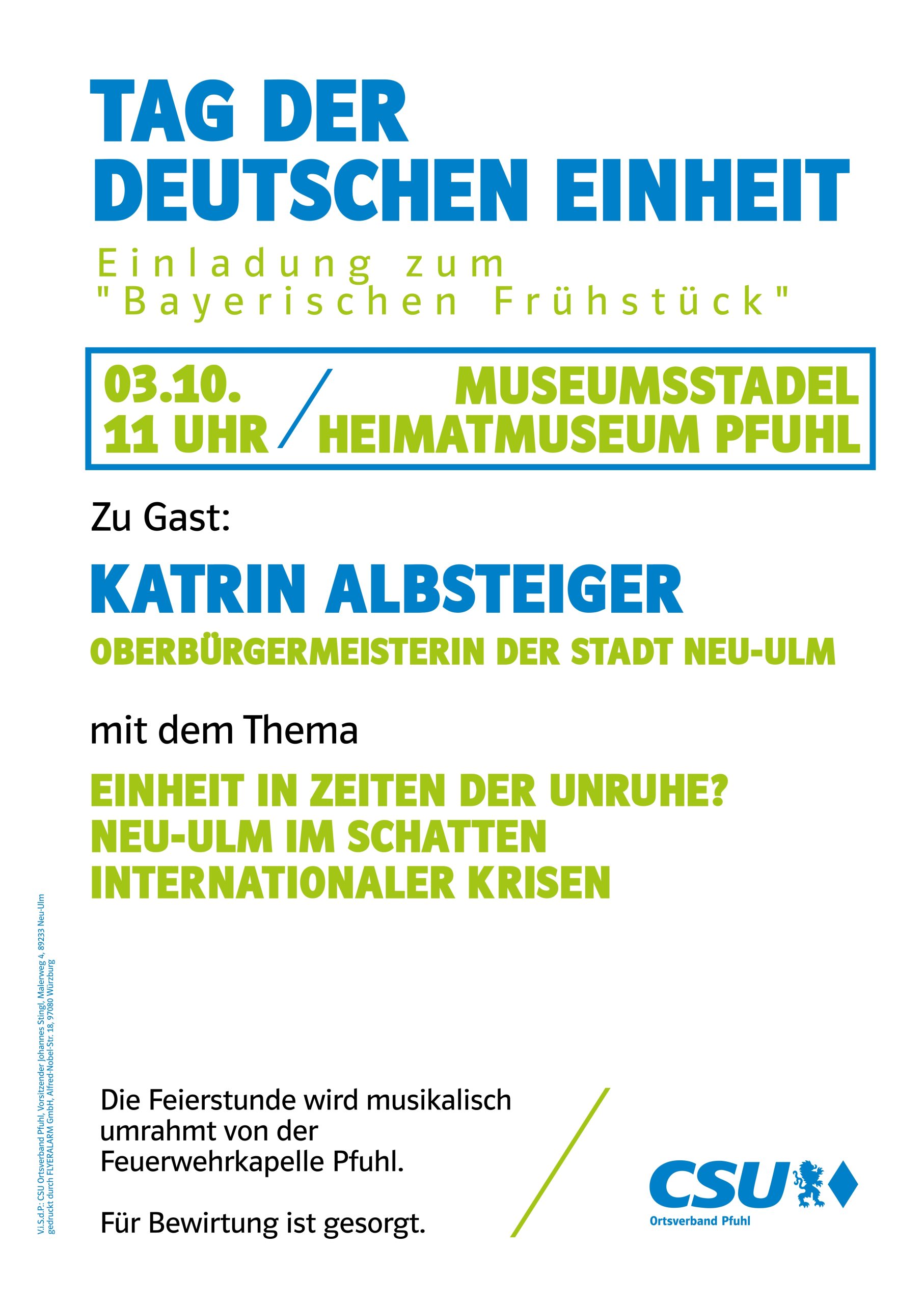 Der CSU-Ortsverband Pfuhl lädt auch dieses Jahr zum traditionellen „Bayerischen Frühstück“ ins Museumsstadel nach Pfuhl.
